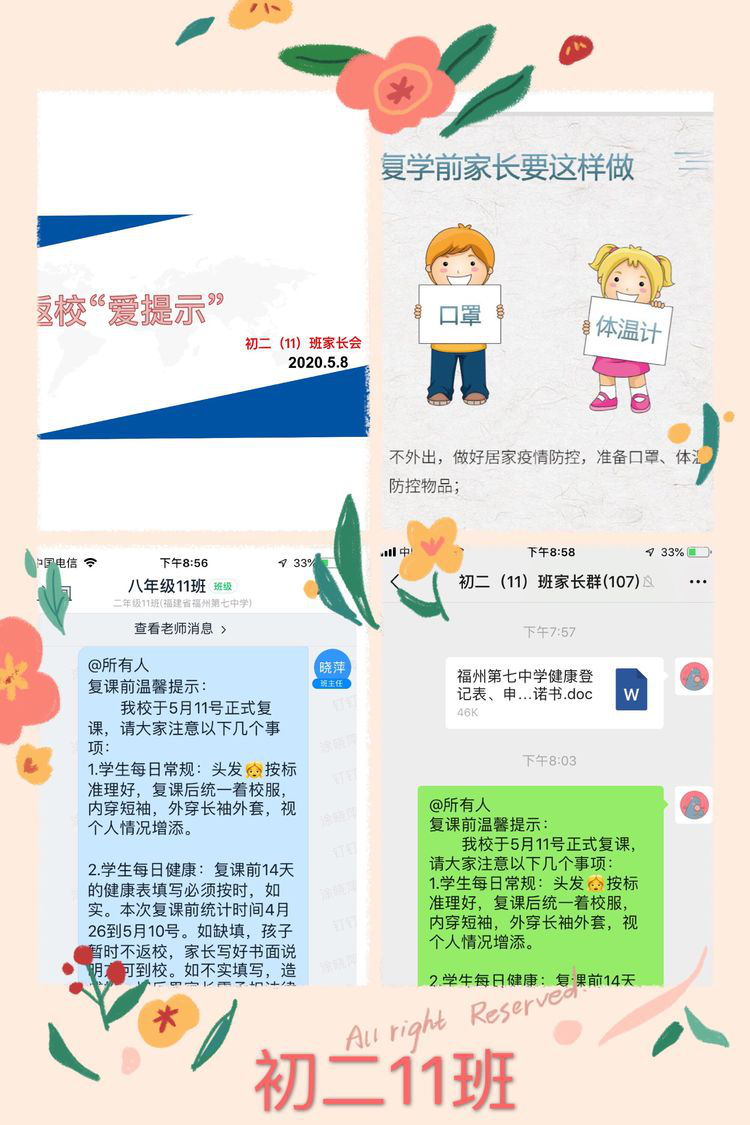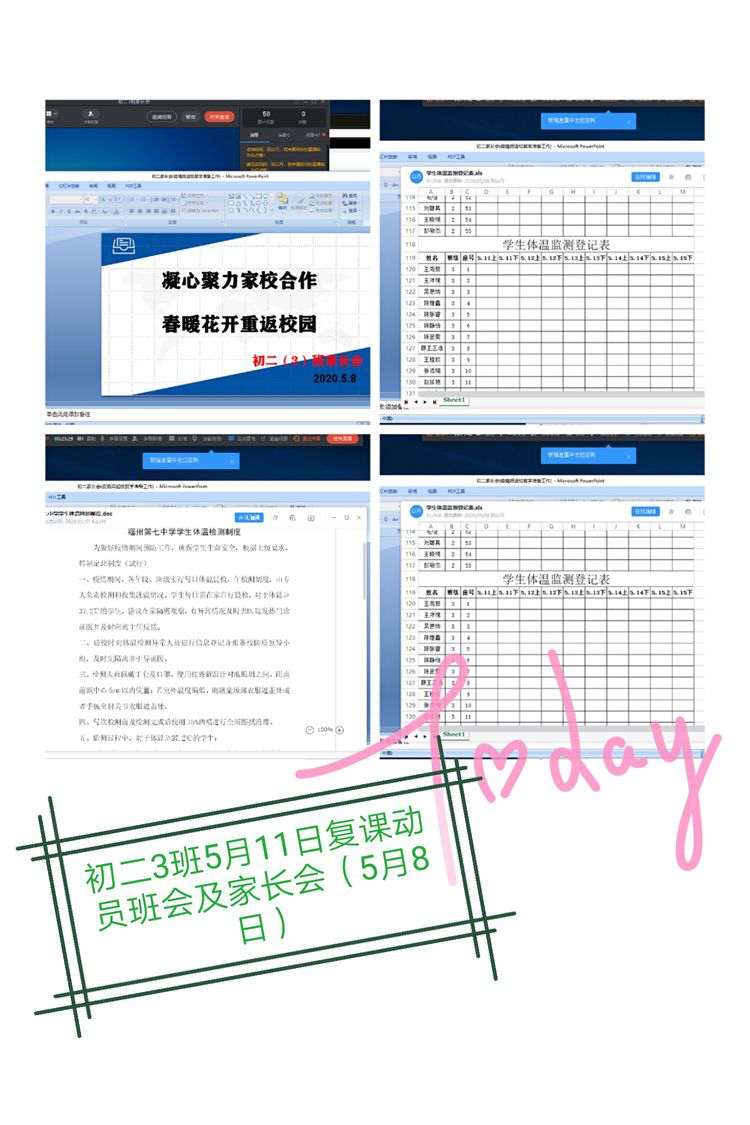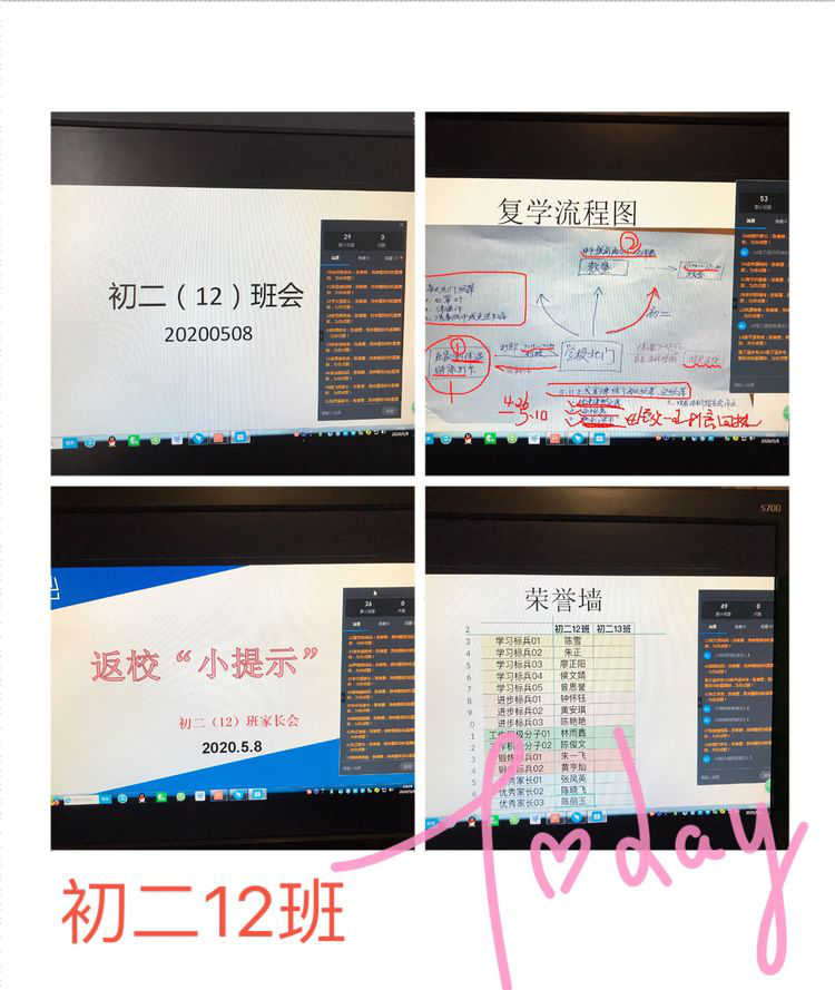 人间四月芳菲尽,五月榴花照眼明。复课在即,为加强家校联结,提高家长亲子教育的技巧,和谐亲子关系,更好地助力学生返学复课,确保复学后各项工作顺利进行,把疫情防控工作细致化、具体化,5月8日晚7:30,根据学校要求,在年段的统一部署下福州七中初二年段各班班主任通过钉钉直播方式召开复学线上家长会。
