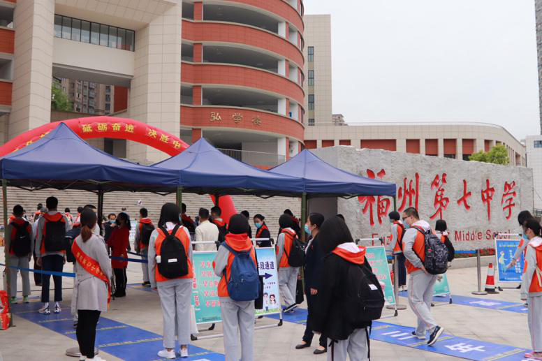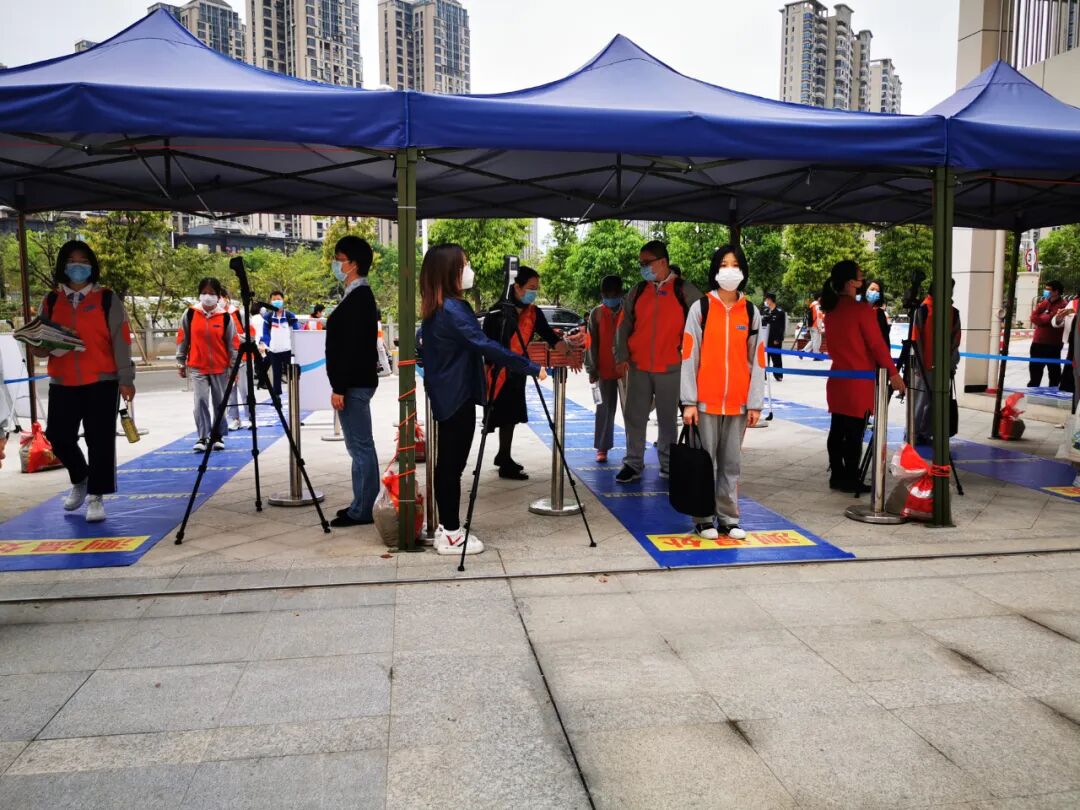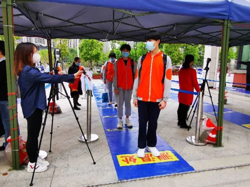 按照前期的预案演习流程,学校执行严格的学生入校体温检测制度,以严谨的态度与熟练的操作,保障学生入校安全。学生入校均佩戴口罩,校园大门设置了六个入校通道,通道上每隔1米贴有学生进校排队的安全距离标识。学生必须通过人体热成像系统测温正常后,才能进入校园。