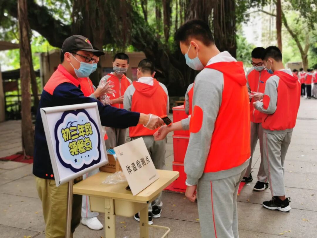 为切实保障初三学子返校复学工作顺利进行,伟德足球官网下载安装党员教师争当先锋,积极投身学校疫情防控和复学工作中,肃静的校园里,这一簇簇红色的身影忙碌着,引导学生顺利的进行入校体温检测。