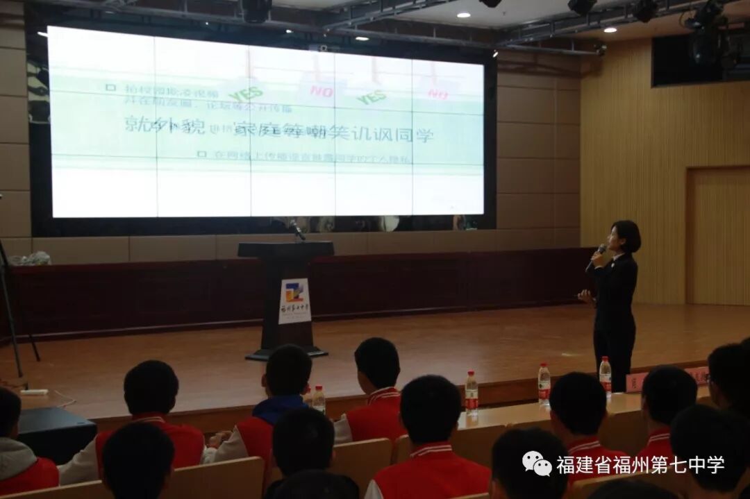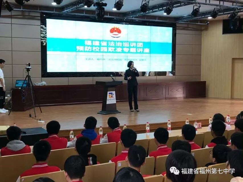 为预防校园欺凌行为,增强学生法治意识,创建平安和谐的校园环境。12月26日,福建省法治巡讲团走进七中,以我校为全区宣讲主会场,开展“法治进校园”系列巡讲活动,向广大师生宣传“预防校园欺凌”的重大意义和主要内容,倡导大家共同创建平安和谐校园。
