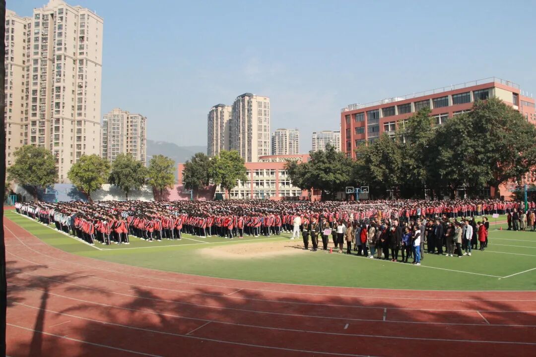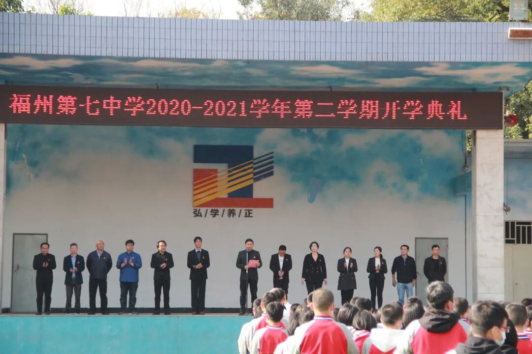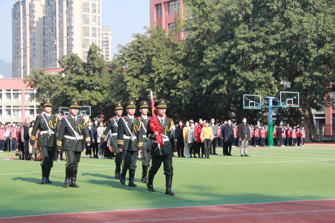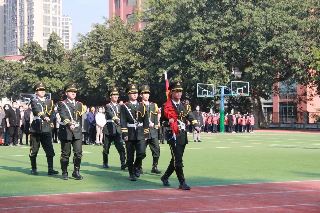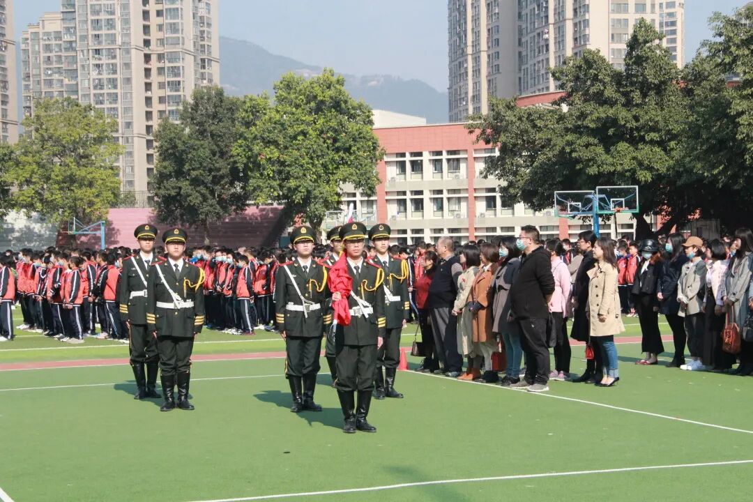 国旗护卫队迈着铿锵有力的步伐入场。在初春的暖阳下,伴随着庄严的国歌,鲜艳的五星红旗缓缓升起,在场师生肃然行注目礼,齐唱国歌。