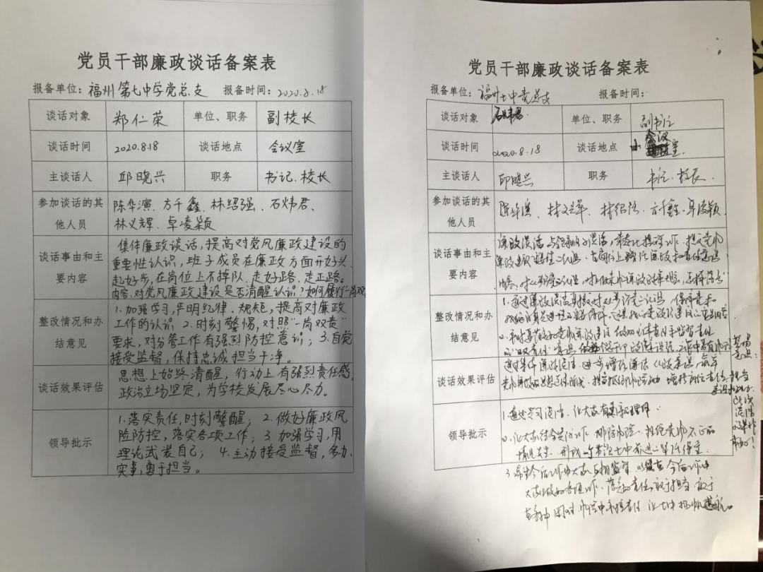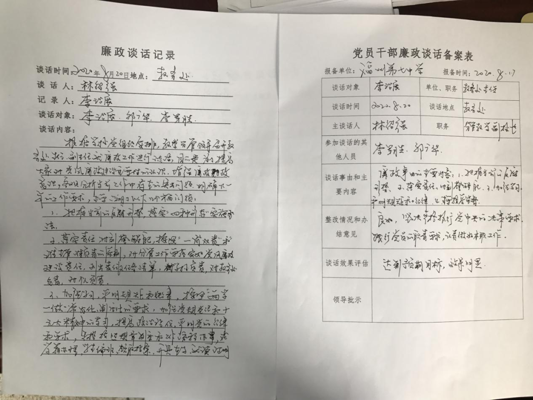 根据福州市委《关于在全市开展常态化廉政谈话提醒工作的实施方案(试行)》要求,我校在全体行政人员中开展廉政谈话,谈话范围包含主要领导和班子其他成员之间、分管领导和科室负责人之间、科室负责人和科室干部之间。