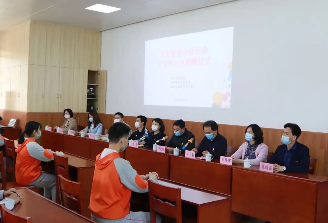 2020年4月30日上午,简短而温馨的捐赠仪式在我校举行。作为爱心公益活动代表,海峡教育报社总编辑黄青女士、编委林忠锦先生、编辑部副主任罗小春先生以及黄政、卢南希先生;福州市新东方培训学校党总支代表李丹静老师、张恩甜老师出席了捐赠仪式,我校邱晓兴书记带领校级领导班子以及初三师生代表接受捐赠。