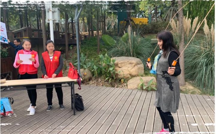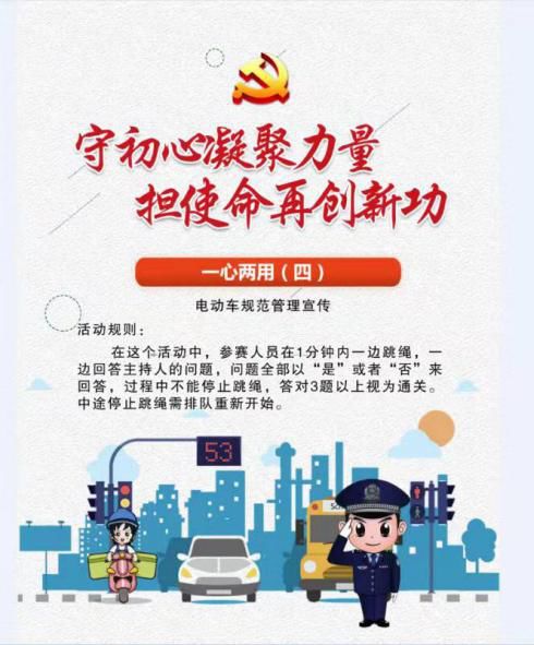 胡俊英教师一边挥舞着跳绳,一边回答关于电动车交通安全的问题,真的是要一心两用!