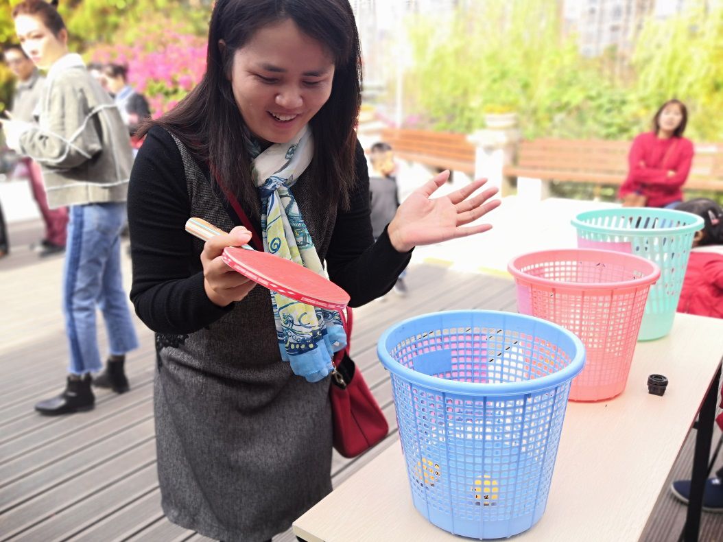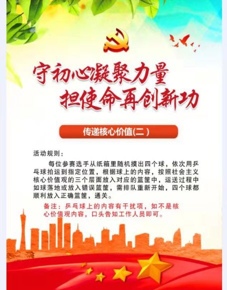 运送乒乓球是一个技术活,我们的胡俊英老师又快又准确地将写着社会主义核心价值内容的球投入对应的三个层面(国家、社会、个人)的筐中。