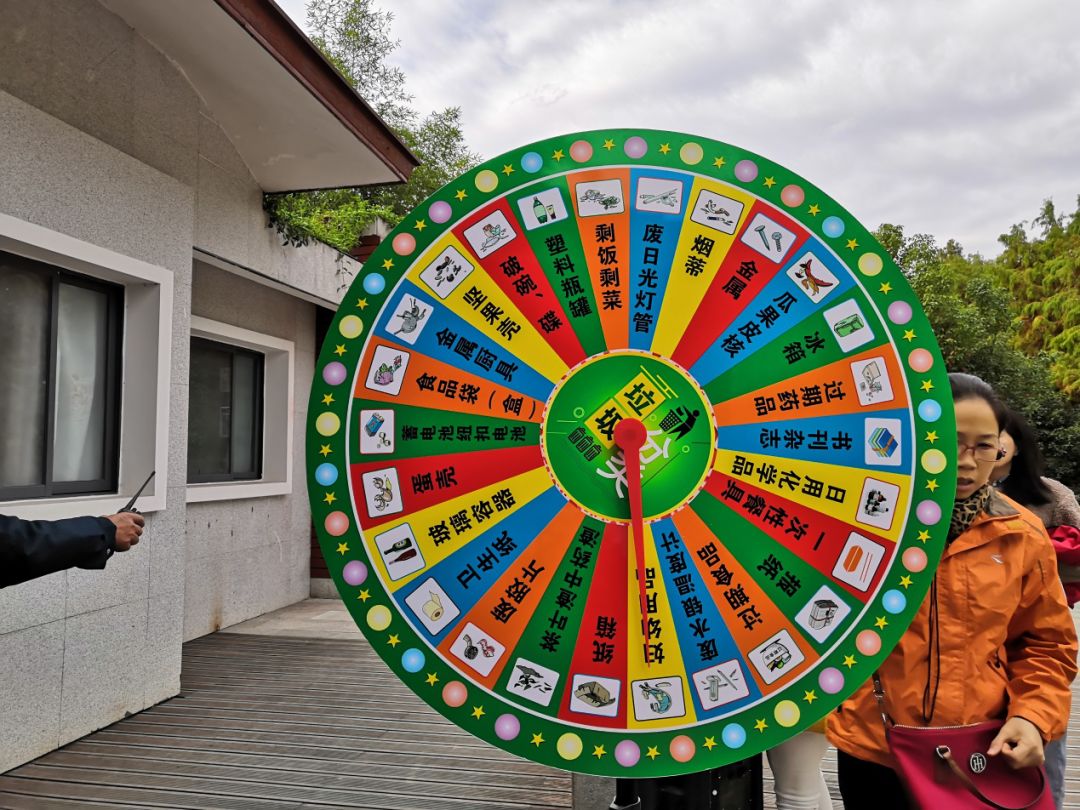 大转盘指针指向的废弃物品,参赛选手回答其属于哪一类垃圾。“过期药品属于有害垃圾”、“污染的纸张属于其他垃圾”……这些简单的问题并没有难倒我们学校的教师。