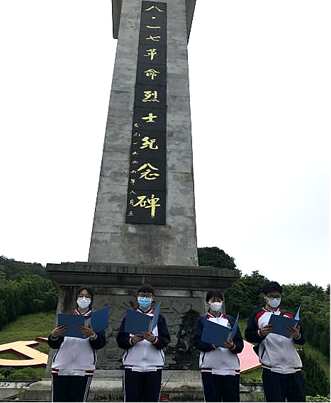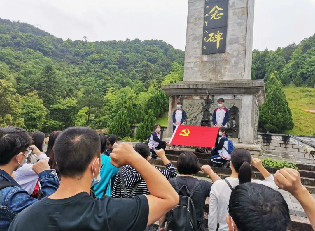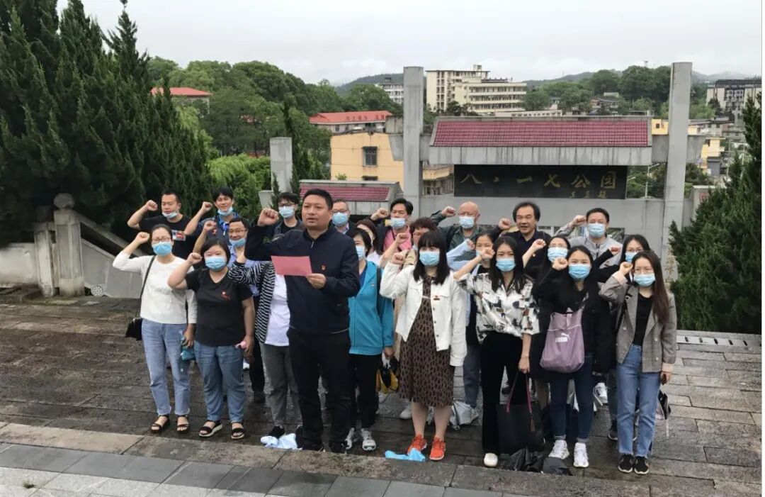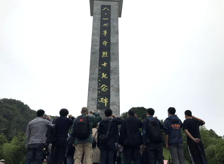绕过群山峻岭,党员同志们来到了八·一七公园,瞻仰纪念碑,缅怀先烈,崇敬之情油然而生。尽管下着毛毛细雨,党员同志们仍铿锵有力地重温入党誓词。